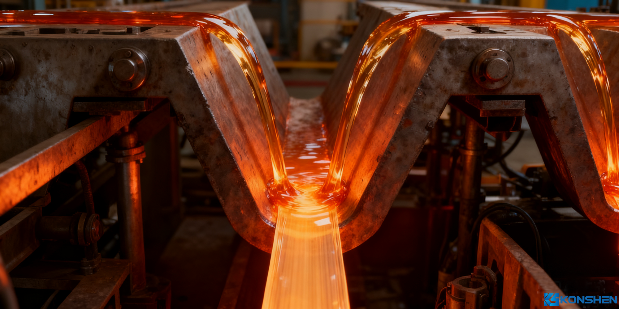 The molten glass overflows the trough’s edge, forming two symmetrical "glass streams" that flow down the trough walls.