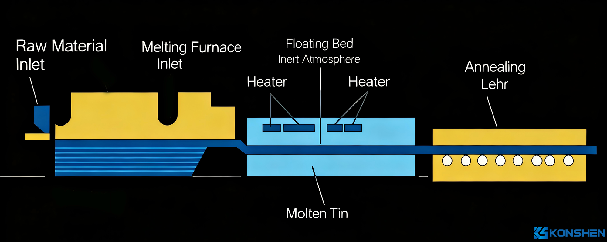 Molten glass flows continuously from a melting furnace and floats on the surface of molten tin (which has a higher density). Under the action of gravity and surface tension, the molten glass spreads out and flattens on the molten tin surface, forming a glass ribbon with flat upper and lower surfaces. After hardening and cooling, the ribbon is pulled onto a transition roller table. The rollers of the table rotate to pull the glass ribbon out of the tin bath and into an annealing lehr. After annealing and cutting, flat glass products are obtained.