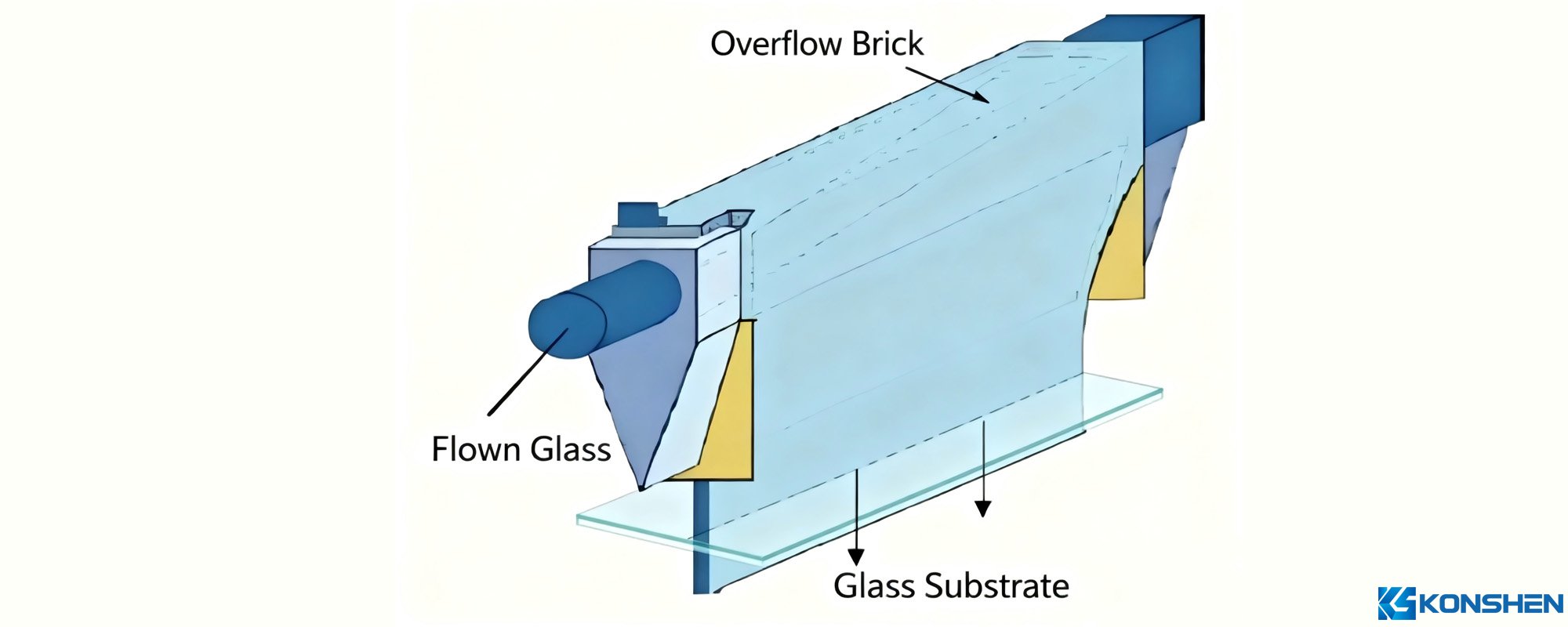- Under gravity, the glass flowing down both sides converges at the bottom to form a flat glass ribbon. The thickness and quality of the glass can be adjusted by controlling the overflow rate and mold temperature.